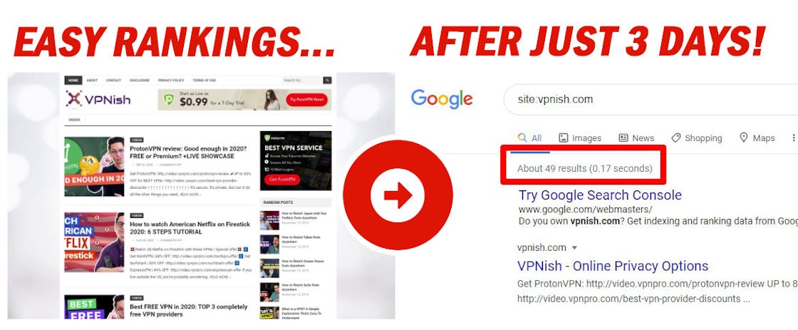 After just 3 days, we had 49 of our website posts indexed and ranking in Google for free traffic!